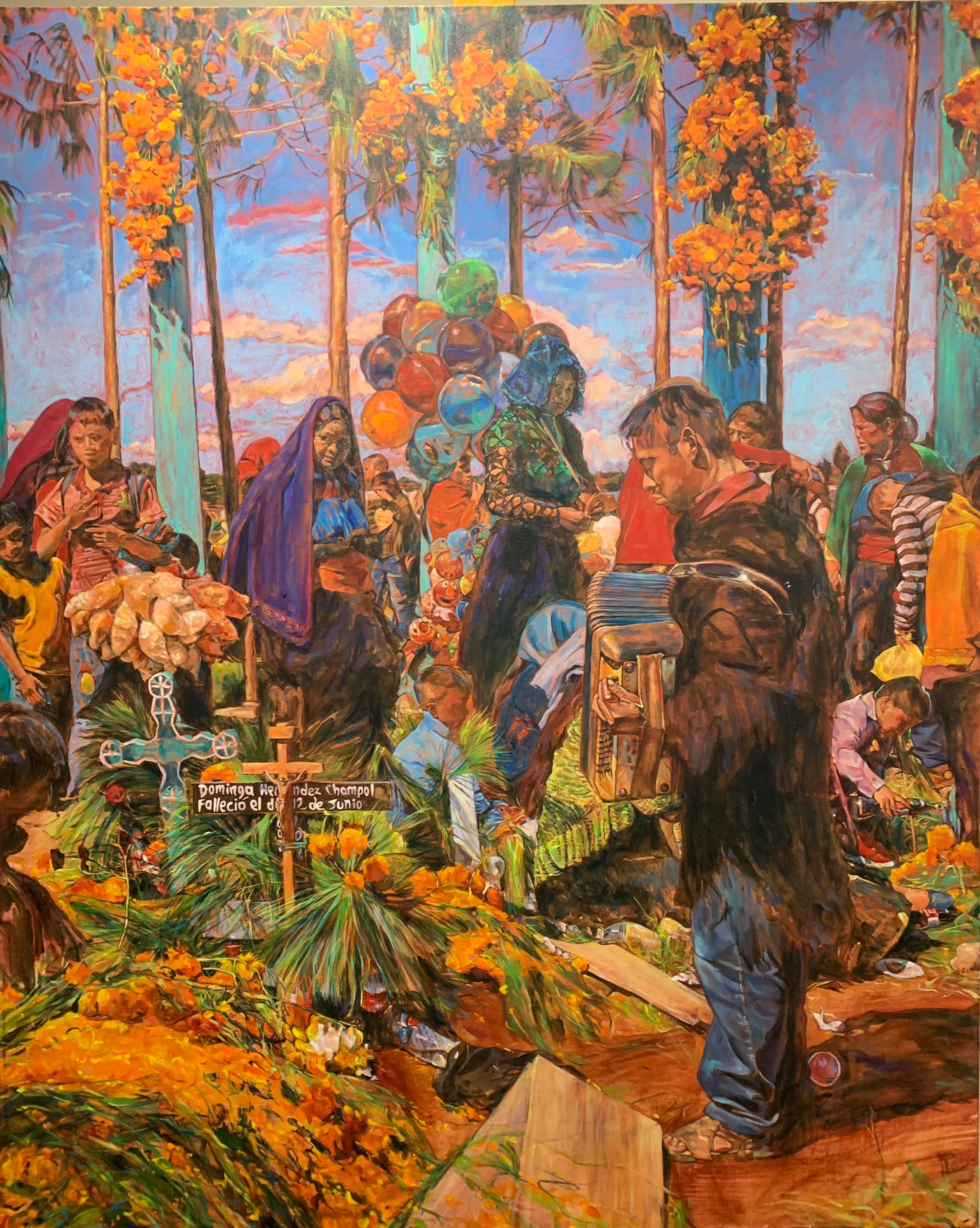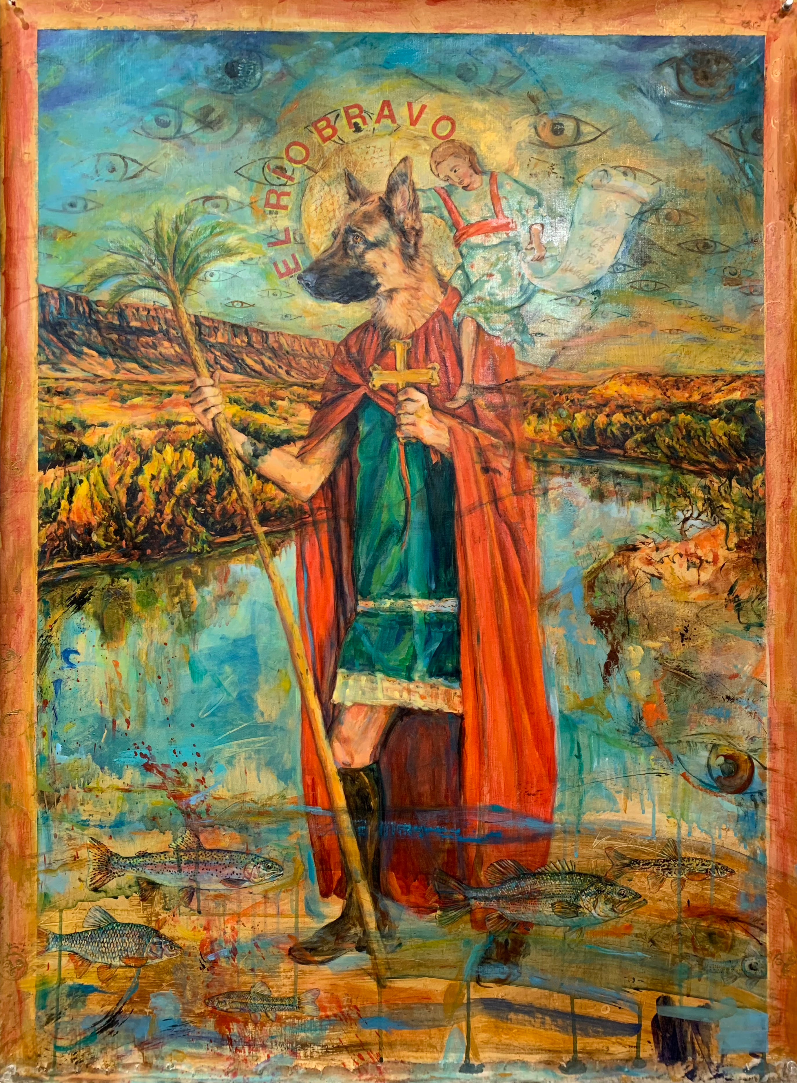 practices are a merging of ancient Indigenous rites, rituals and beliefs, meshed with Catholicism. “Día de los Muertos is a celebration of both the living and the dead,” Alder states, “And the underlying theme of this work has much to do with the cycle of life and death — My reaching back to my ancestors… My rising consciousness of my own mortality… The continuation once I’m gone and become myself an ancestor.” Blending the styles of the Mexican muralists and the impressionists, each painting in Animal Spirits and Ancient Rituals evokes the artist’s ancestral searching, yearnings, experiences, emotions and opinions — while encouraging others to reflect upon their own ancestry and personal journeys. Alder’s prints feature the artist’s personal interpretation of La Lotería – a traditional Mexican board game as well as an inspirational templet commonly used by many artists. The daughter of an immigrant, Alder skillfully weaves the rudimentary pictures of La Loteria into Indigenous, political and religious iconography to create a complex arrangement of memory, political commentary, and symbolism. Indeed, through vivid paintings of Chiapas and the bold imagery of La Loteria, Animal Spirits and Ancient Rituals transports us to Alder’s inner visual world, while also offering important messages confronting the migrant crisis between the Mexican and U.S. border.