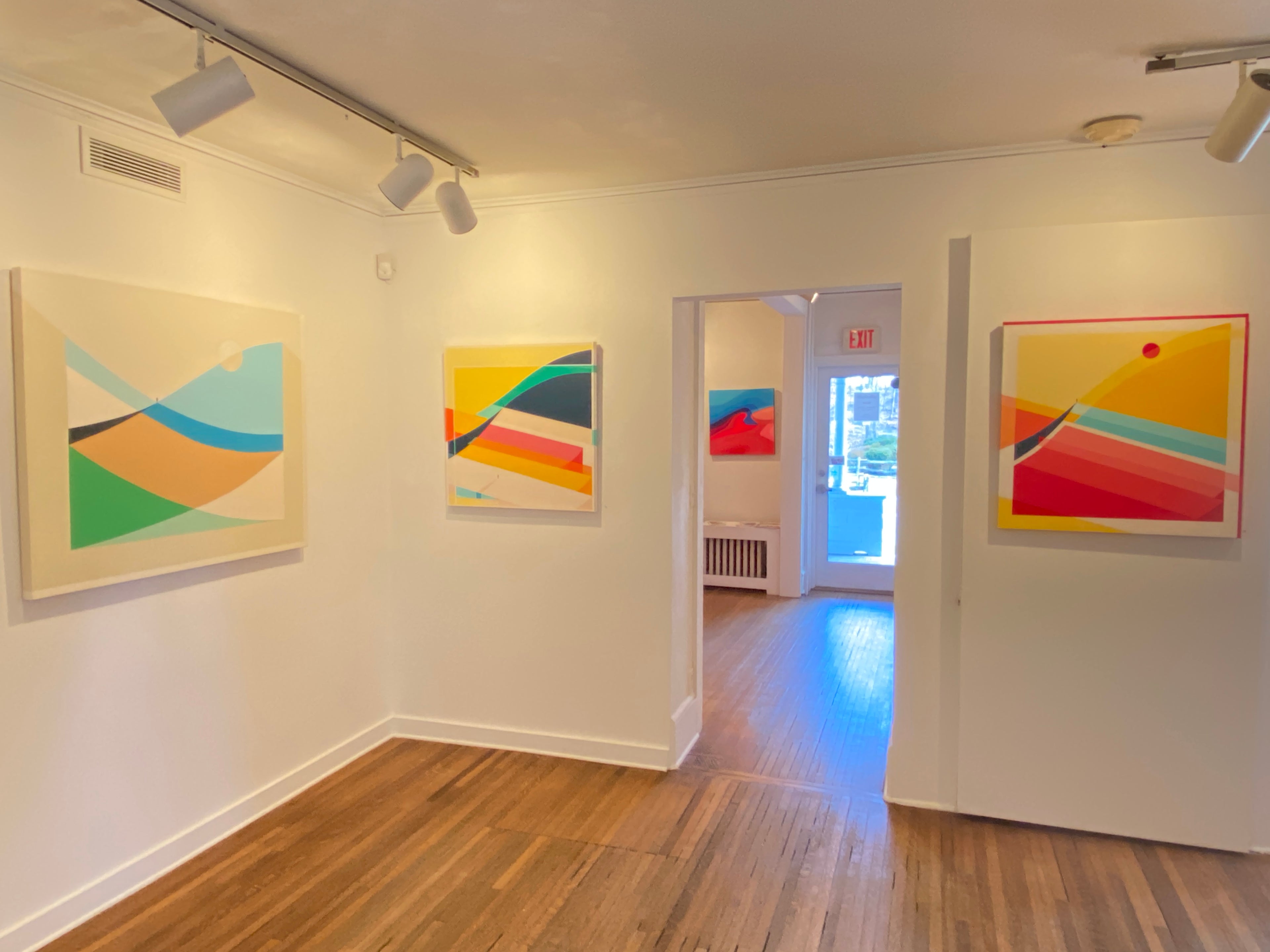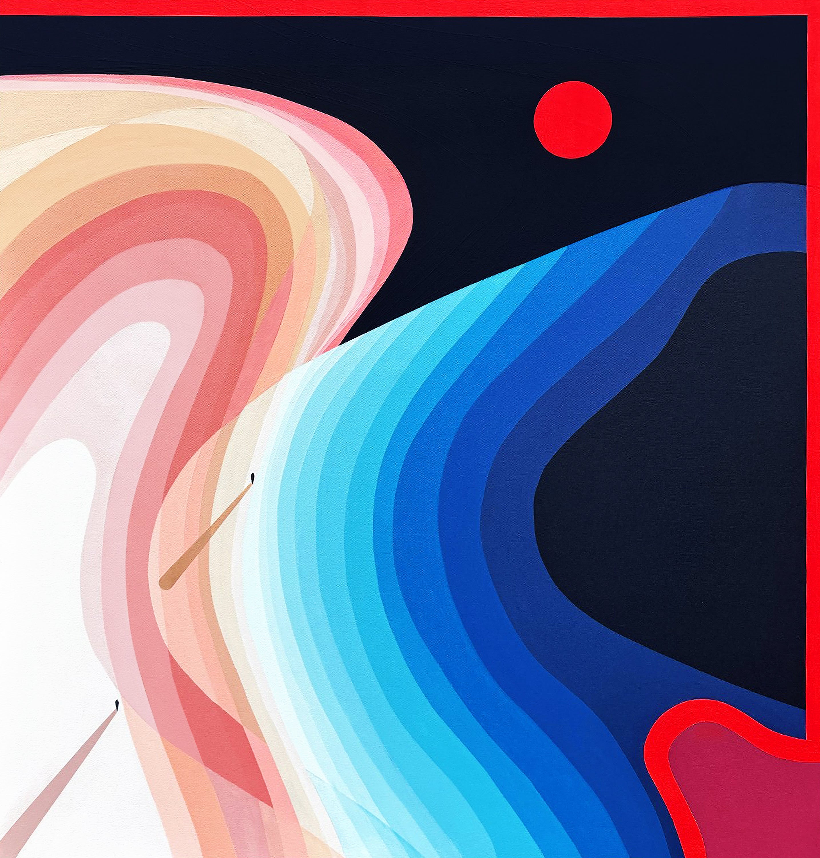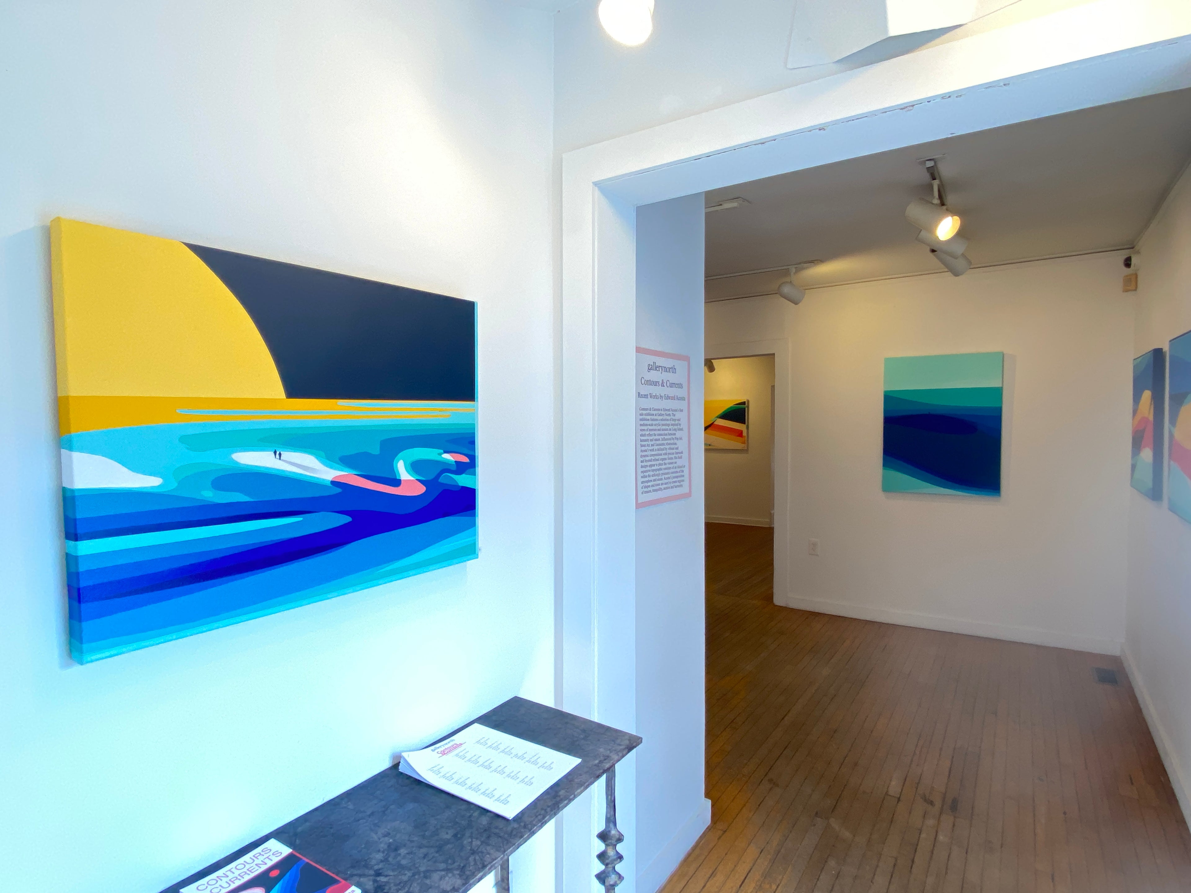 Contours & Currents is Edward Acosta’s first solo exhibition at Gallery North. The exhibition features a selection of large and medium-scale acrylic paintings inspired by views of sunrises and sunsets on Long Island, which reflect the connection between humanity and nature. Influenced by Pop Art, Street Art, and Geometric Abstraction, Acosta’s work is defined by vibrant and dynamic compositions with precise linework and layered refined organic forms. His bold designs appear to place the viewer on expansive topographic contours of an island or within the strikingly prismatic currents of the atmosphere and ocean. Acosta’s juxtaposition of shapes and tones are used to create regions of tension, tranquility, motion and harmony.