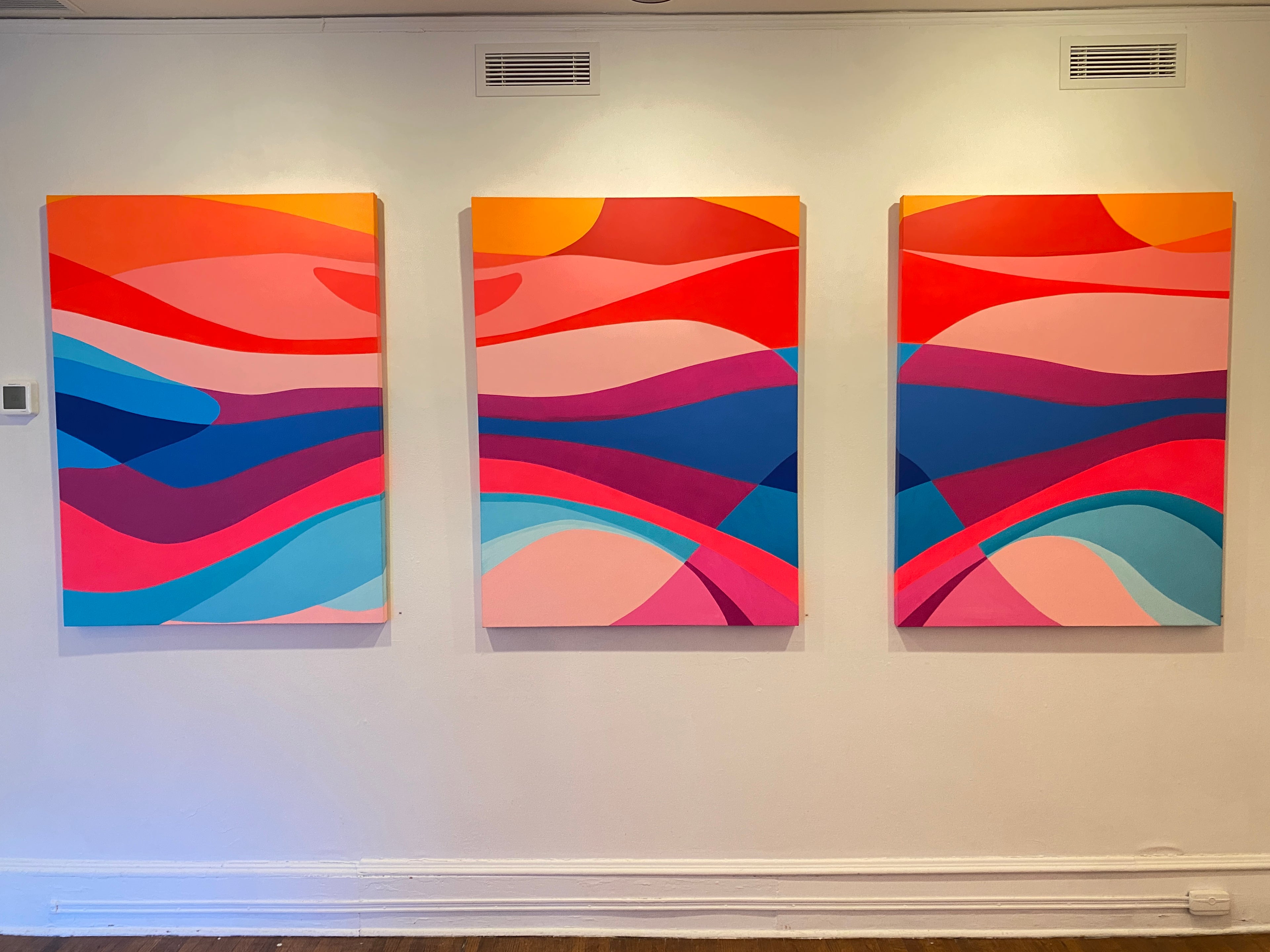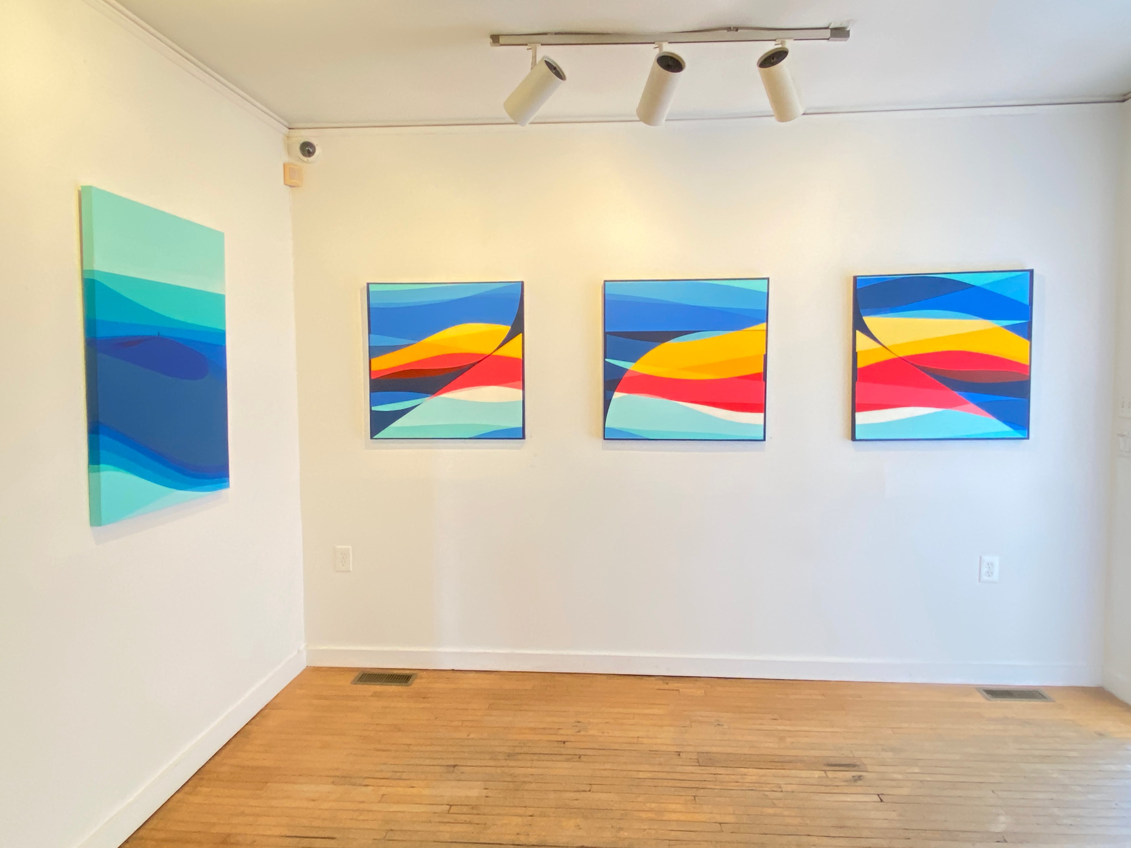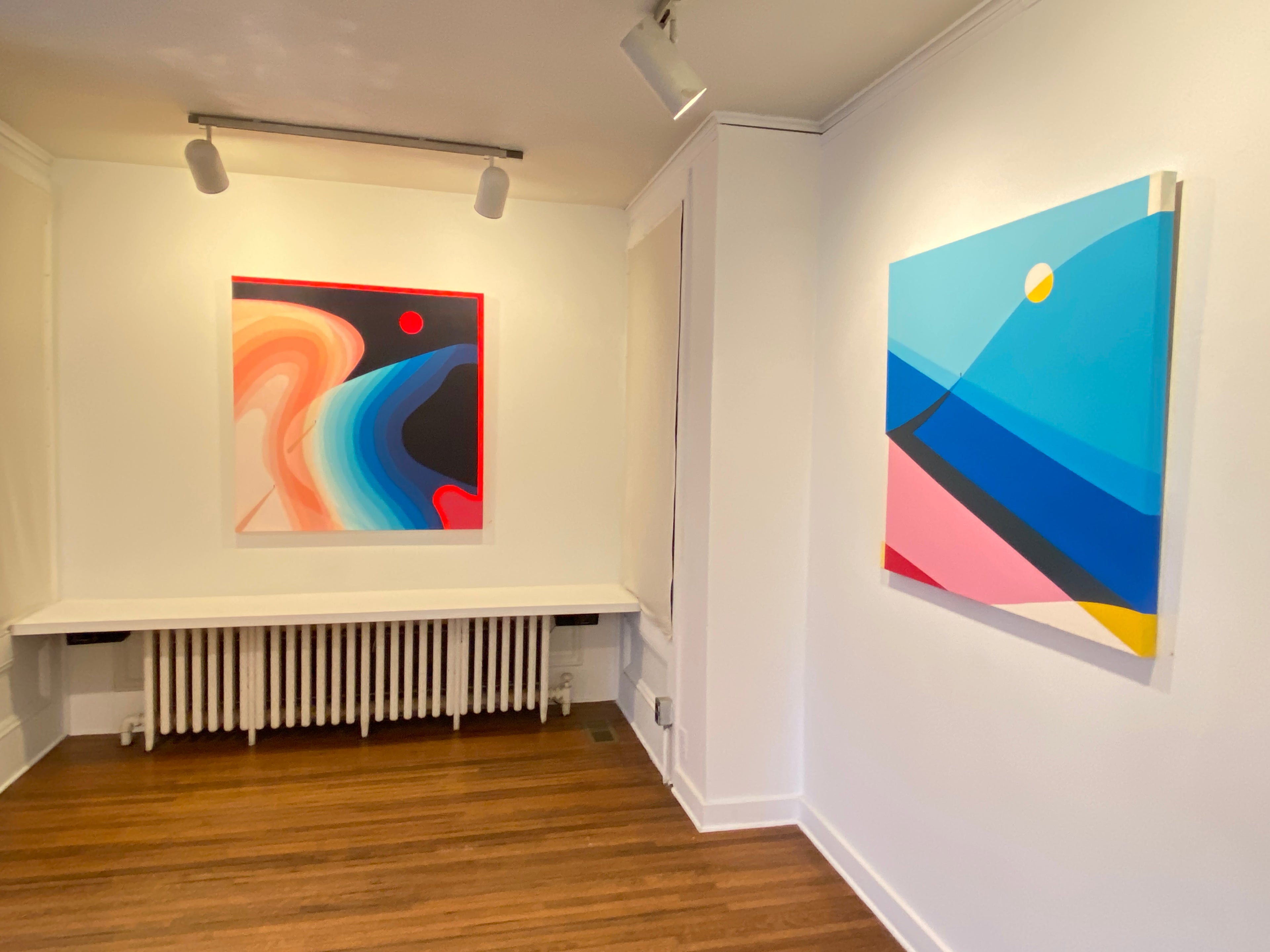 Contours & Currents is Edward Acosta’s first solo exhibition at Gallery North. The exhibition features a selection of large and medium-scale acrylic paintings inspired by views of sunrises and sunsets on Long Island, which reflect the connection between humanity and nature. Influenced by Pop Art, Street Art, and Geometric Abstraction, Acosta’s work is defined by vibrant and dynamic compositions with precise linework and layered refined organic forms. His bold designs appear to place the viewer on expansive topographic contours of an island or within the strikingly prismatic currents of the atmosphere and ocean. Acosta’s juxtaposition of shapes and tones are used to create regions of tension, tranquility, motion and harmony.