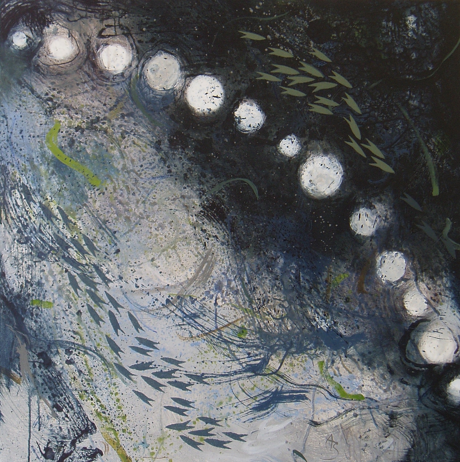 Elements Adrift is Anne Seelbach’s first solo exhibition at Gallery North. It features oil and acrylic paintings that reflect her lifelong fascination with the seasons, tides, and marine life, as well as her recent interest in the Earth’s elements. Comprised of three of Seelbach’s distinct series from the last ten years, Elements Adrift fluctuates between representation and abstraction. In her first series, the artist explores the shoreline. Stylized motifs of fish, gaskets, and netting populate the layered surfaces. Drawn from her time walking alongside the ocean, these works silently represent the slow degradation of our natural resources; here is the muck of pollution; over there are the piquant colors of chemicals mixing with sea water. Seelbach’s brownish hues, deep blues, and rusty reds, layered upon stenciled forms both man-made and natural, provide a sense of loss while offering a conservationist’s razor-thin glimmer of hope. In her second series, the artist shifts her attention to tidal pools and the majestic power of the moon. Based on her repeated visits to Monhegan Island in Maine, Seelbach’s works, such as In the Moon Reflection Life Begins, seem to draw awe-inspiring energy from the moonlight. The artist is endlessly fascinated by how this energy drives her imagination. These canvasses are richly expressive of a dark power and resonate in many ways with the third series featured in the exhibition. Reflecting her most recent work, the third group of works in Elements Adrift shows Seelbach digging into the periodic table, examining each element one by one – iron, carbon, mercury – through painterly abstraction. There is an ebb and flow throughout this exhibition. Seelbach’s paintings move from representation to abstraction, from hope to despair, and from the natural to the personal. Her richly layered artworks are endless, and require the type of deep looking that might seriously affect our inner self.