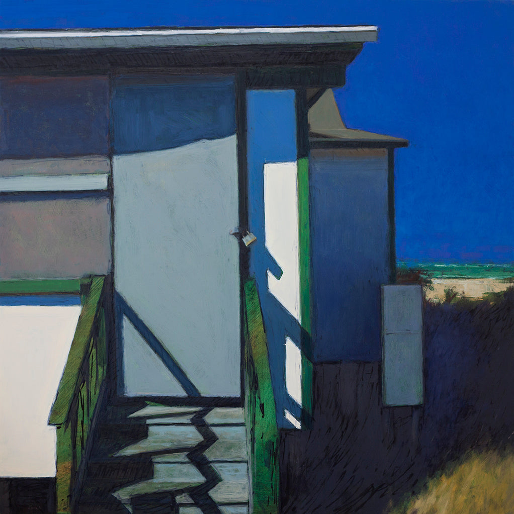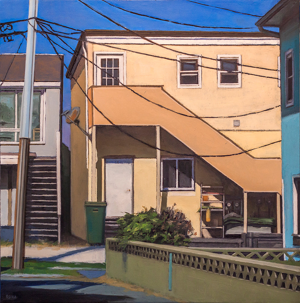 Doug Reina’s first solo exhibition at Gallery North, Prolonged Perception: Recent Paintings by Doug Reina highlights the artist’s exploration of obscure, ordinary spaces of contemporary life that are often shielded from view. Austere, brooding compositions, Reina’s paintings find a dream-like emptiness within back streets, shacks, and overgrown backyards. Each painting begins black. Color and form are added over a black ground, lifting them out of the picture plane. Colors blast forth. There are broad flashes of light, but the black ground remains visible everywhere. It pops out between brushstrokes or creates a colossal abyss below buildings, pulling the rug out from underneath them. There is a rootlessness here. We wander in some lucid dream, half remembered; amid dark voids and divine light. He leads us into a space of sharp contrasts, one in which our eye fragments into the surface it contemplates.