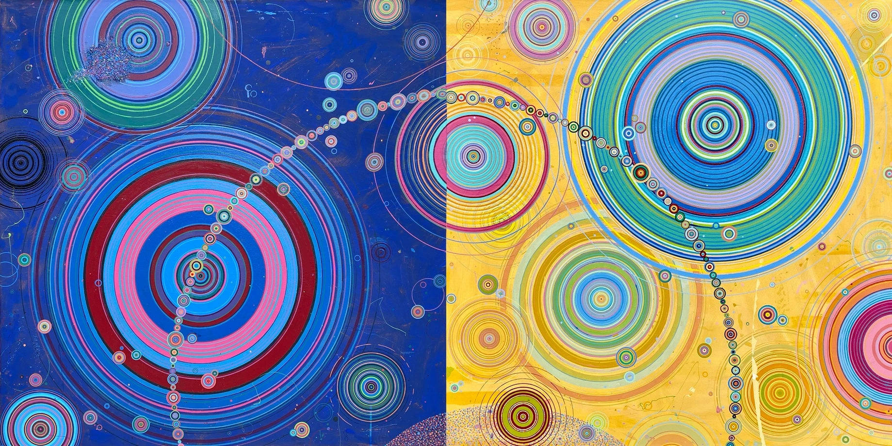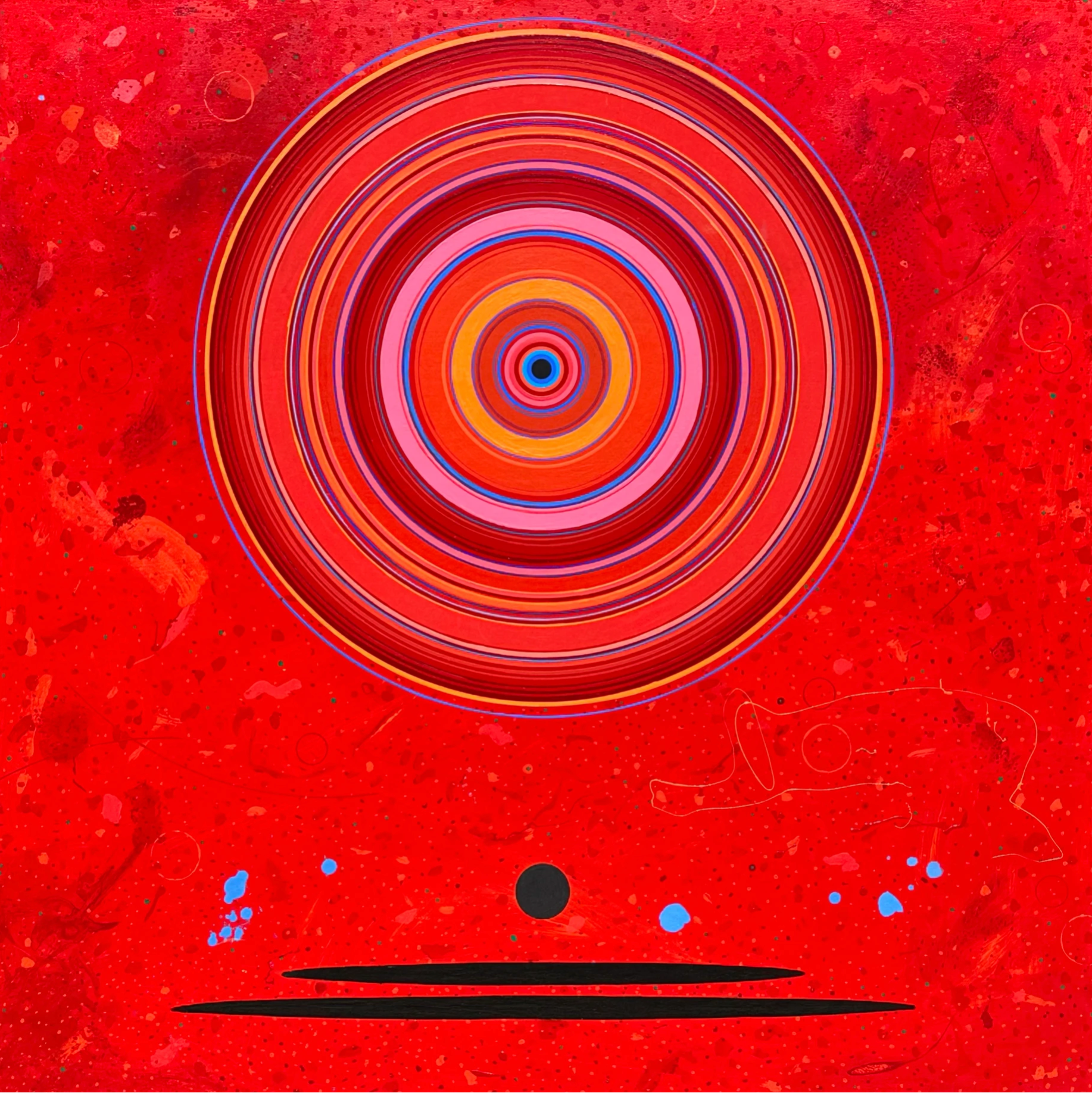 and vivid concentric circles combine to form a dramatic Op Art world in which references