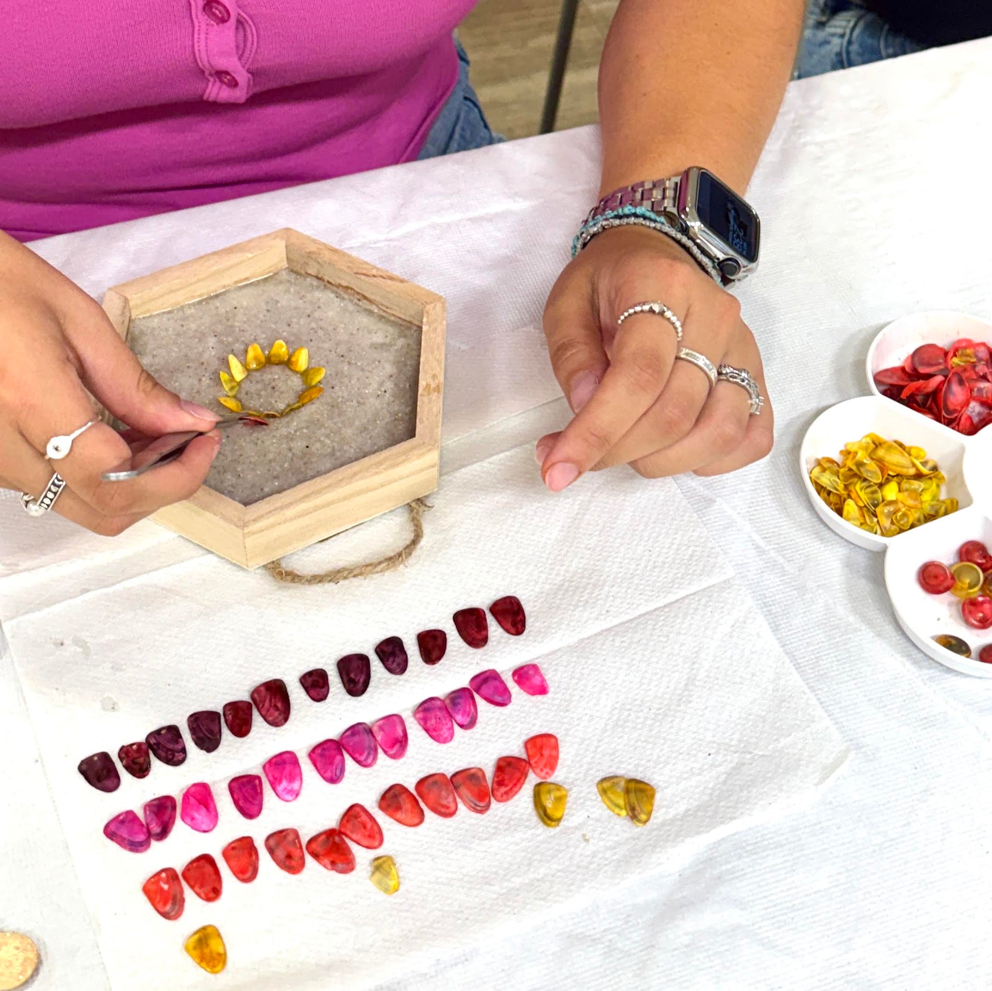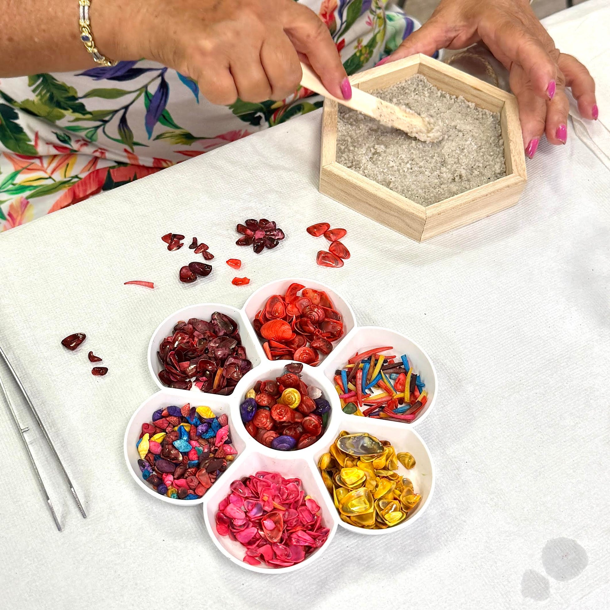 Guided step by step students will learn how to naturally dye a wooden art frame with hibiscus petals. Using a radiant palette of colored seashells, participants then design & layer petals and textures into a joyful mixed media composition set in self-hardening sand. Each finished piece becomes a heartfelt keepsake-ready to hang!