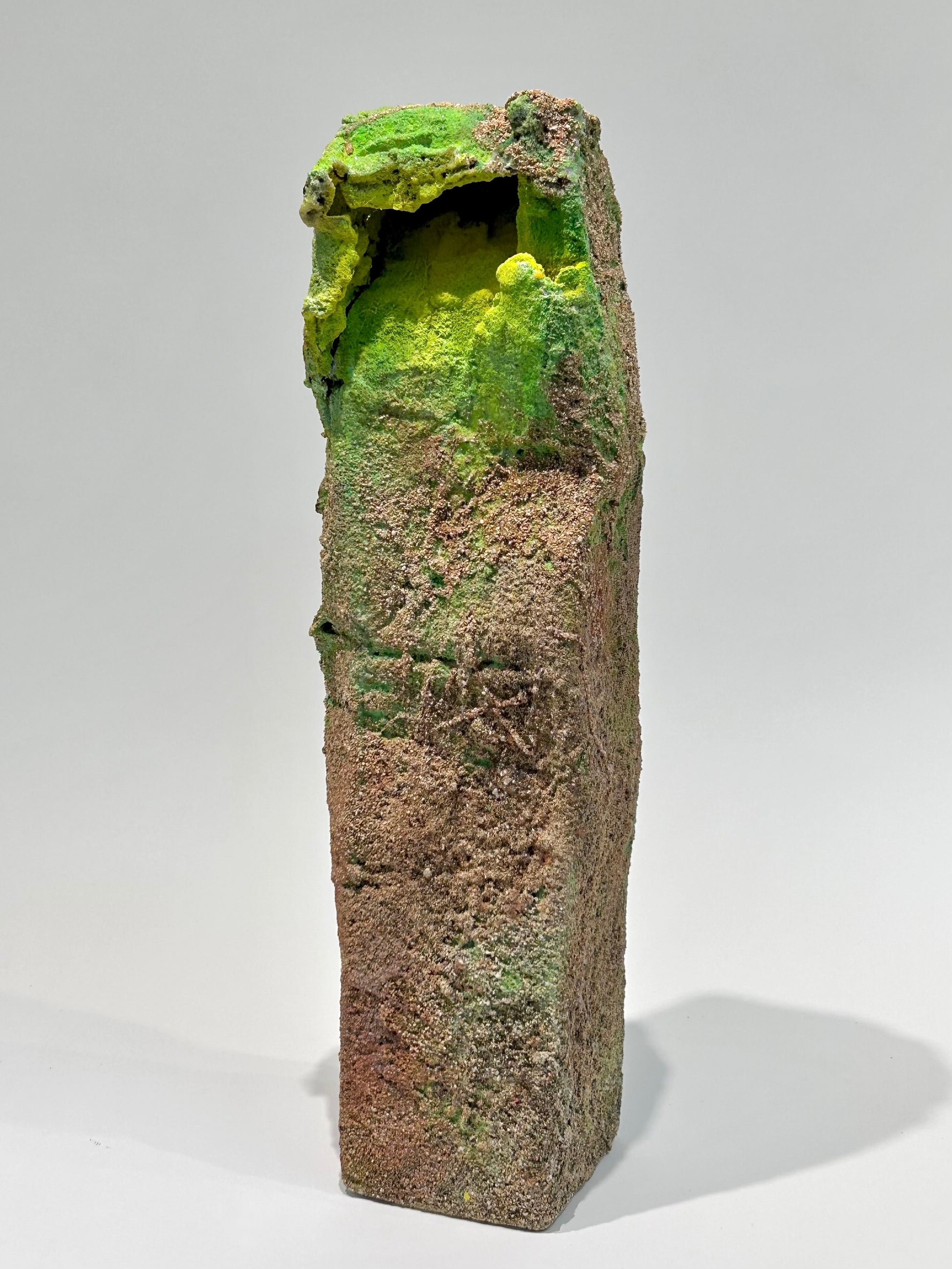 natural and colored sand, debris, polymer glues on cardboard box