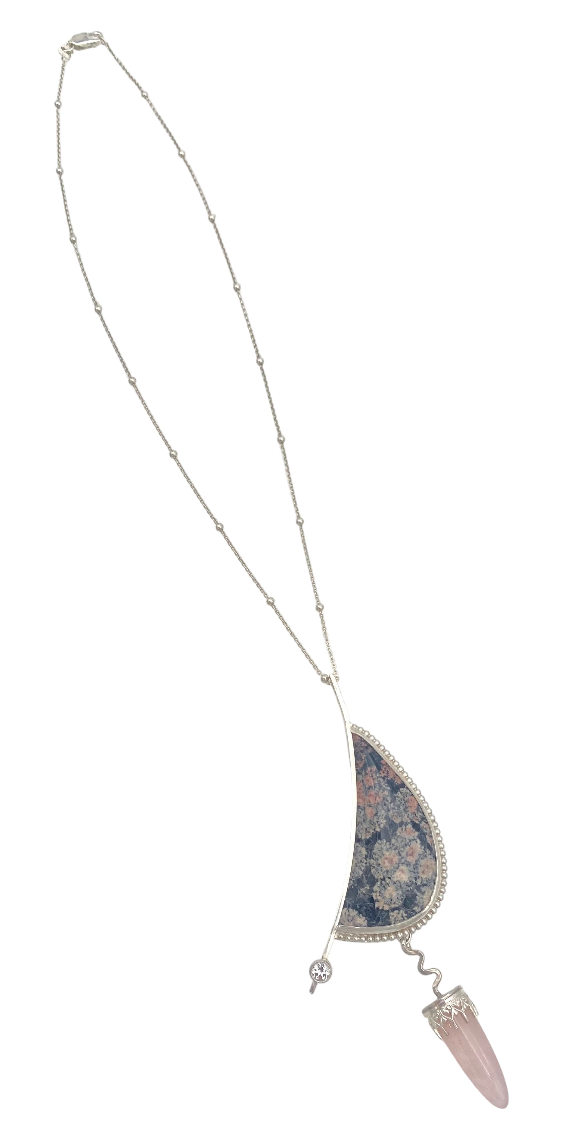 Snowflake Obsidian, Rose Quartz, Simulated Diamond in Sterling Necklace