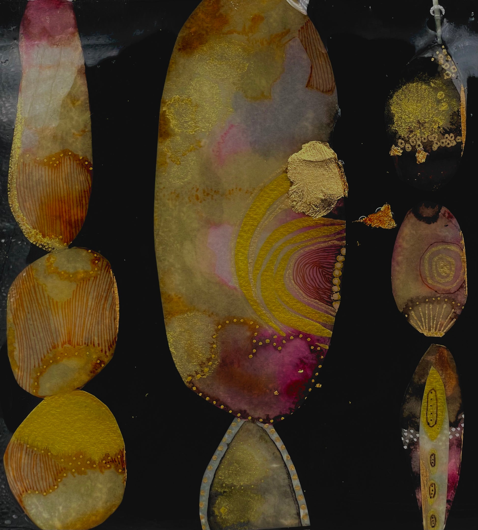 An 8x8 resin-coated collage on a dark stained wood panel.
